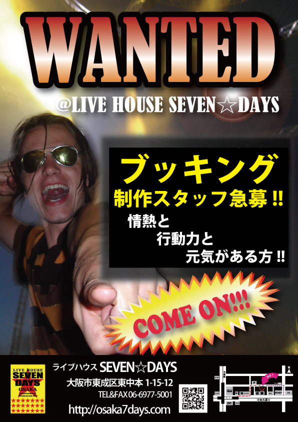 | アルバイト、正社員,共に募集。 *イベントブッキングスタッフ* 給与18万~30万 情熱と行動力と元気を持ち備えた方!! *アルバイト* 業種:バーテンダー、キッチン、 時間:17−4時までの間の8時間。 給与:アルバイト 時給¥800〜 ※曜日、時間、応相談。 ※レギュラー勤務できる方、大歓迎! *社員* 業種:バーテンダー、キッチン、 社員給与:社員候補17万〜 社会保険完備。 アルバイト、社員、ともに、 ものすごい元気で明るい性格のかた。 飲食、音楽が大好きでしょうがないかた。 お待ちしております。 まずは、セブンデイズへ、飛び込んできてください。 06-6977-5001 090-8651-6313(担当直通フルキ) |